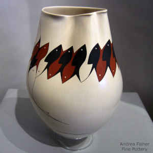 An organic opening on a red jar decorated with a sgraffito fine line and geometric design