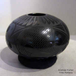 Octavio Andrew is a potter living and working in the village of Mata Ortiz in Chihuahua, Mexico. He was one of Reynaldo Quezada's students and has been making pottery for more than 20 years. He appears to have specialized in painting matte black designs on glossy black jars.